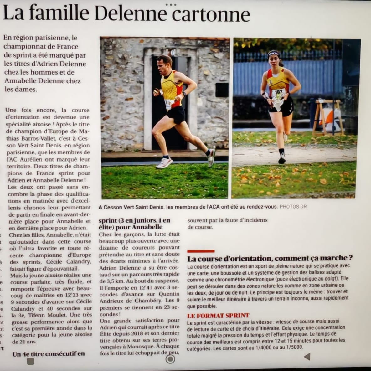 Adrien et Annabelle réussissent l’exploit de gagner tous les 2 dans la catégorie reine, sur les Championnats de France organisés sur la commune de Cesson (77), un terrain résidentiel qui offrait de nombreux choix d’itinéraire. Les deux s’imposent au cours d’un finish haletant, puisqu’Adrien, largement en tête, a perdu de précieuses secondes lors du dernier poste, sous les yeux du public scotché à la retransmission TV. Annabelle a elle terminé dans la même seconde que Florence Hanauer, avant que celle-ci ne fasse des partie des nombreux concurrents piégés par un poste manquant.